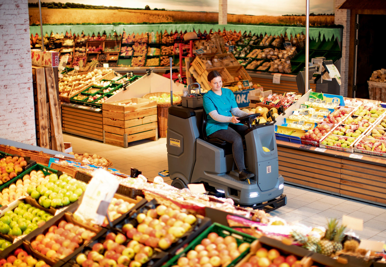 Den åkbara kombiskurmaskinen B110R med 170Ah batterier, inbyggd laddare, sidoskurdäck och Dose kemdoseringssystem samt möjlighet att utrusta med Kärcher Fleet distansövervakningsverktyg.