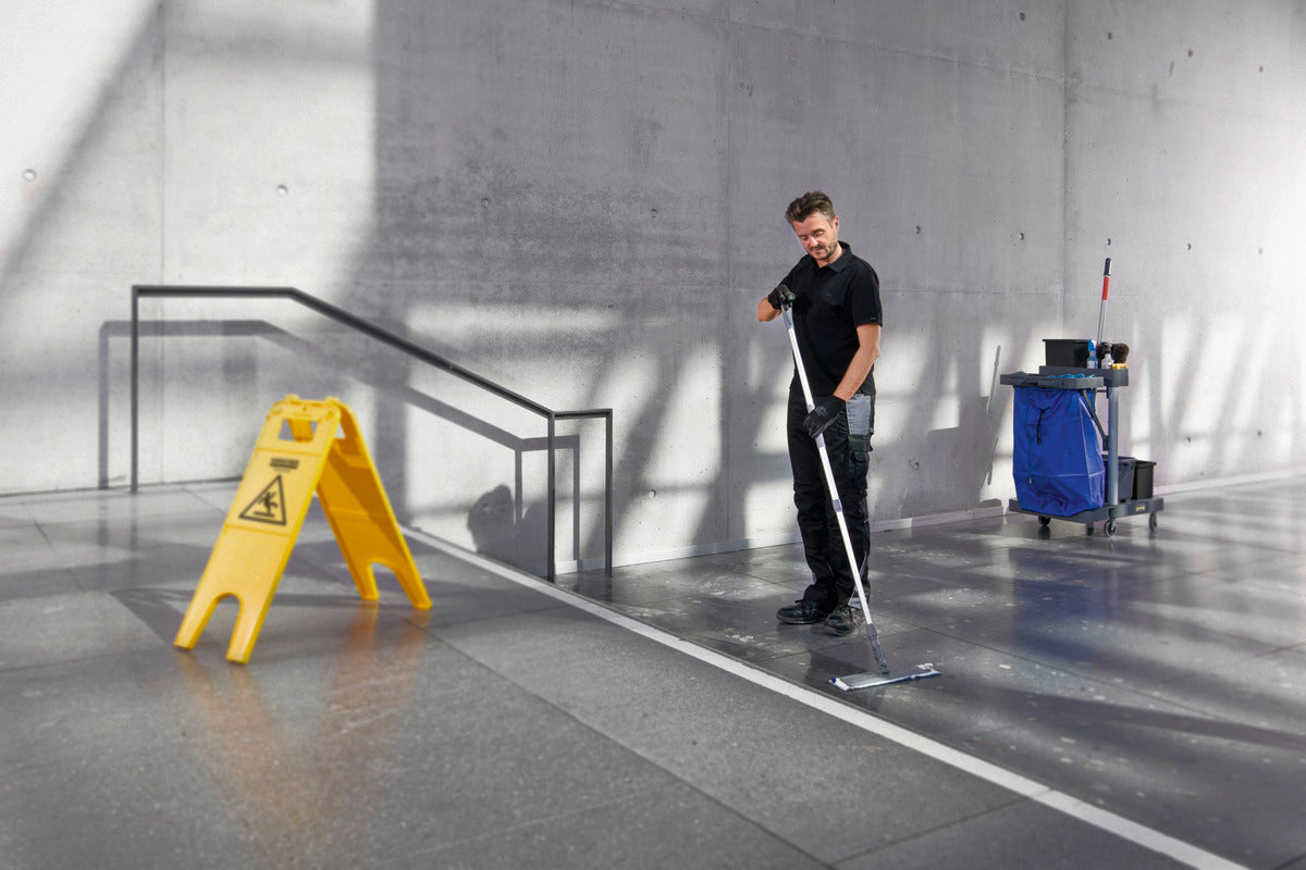 Den funktionella och öppna städvagnen FM Swift 50/ W sparar verkligen på utrymmet som krävs vid användning och förvaring och passar därför väldigt trånga städförråd. Den har ett dubbelhinksystem med en press som blir en perfekt hjälp vid krävande manuella rengöringsuppgifter även då ytan är begränsad. Modulen för avfall kan flyttas upp eller ner eller helt fällas om så krävs vid förvaring. Den har passande påshållare för olika storlekar av påsar. Städredskap kan förvaras enkelt och säkert i dom två 6-liters hinkarna och separeras färgkodat beroende på användningsområde exempelvis blå för oproblematiska ytor och röd för ytor med höga hygienkrav såsom toaletter och motsvarande. Det finns också möjlighet att ha 2 til 4 flaskor rengöringsmedel istället för en av 6-liters hinkarna. FM Swift 50/ W är en del av vår Value Proposition - Standard.