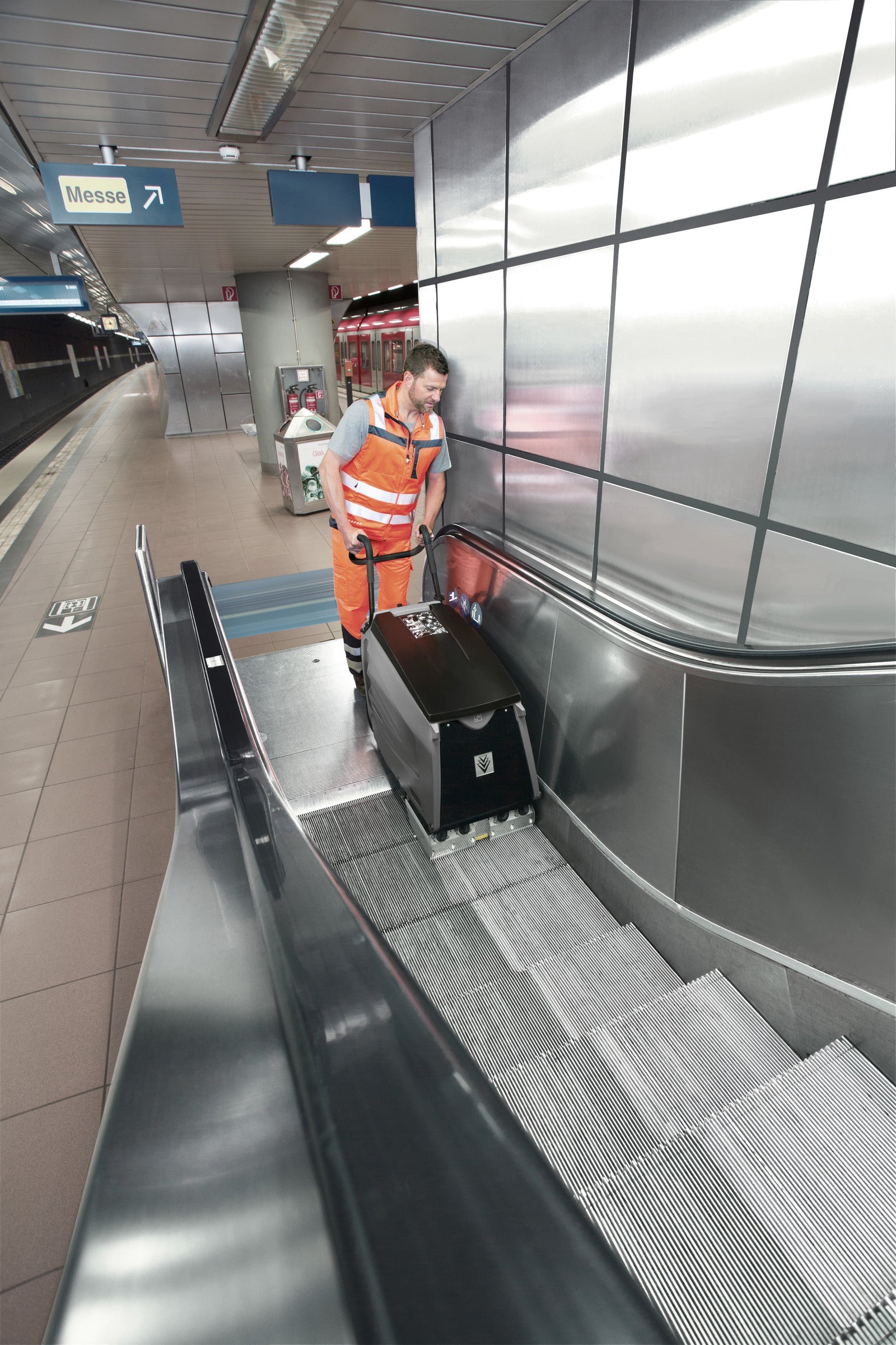 Grundligt rent på nolltid: Med Kärchers trappskurmaskiner blir rulltrappor, rullband liksom trappor och fönsterbrädor skinande rena.
