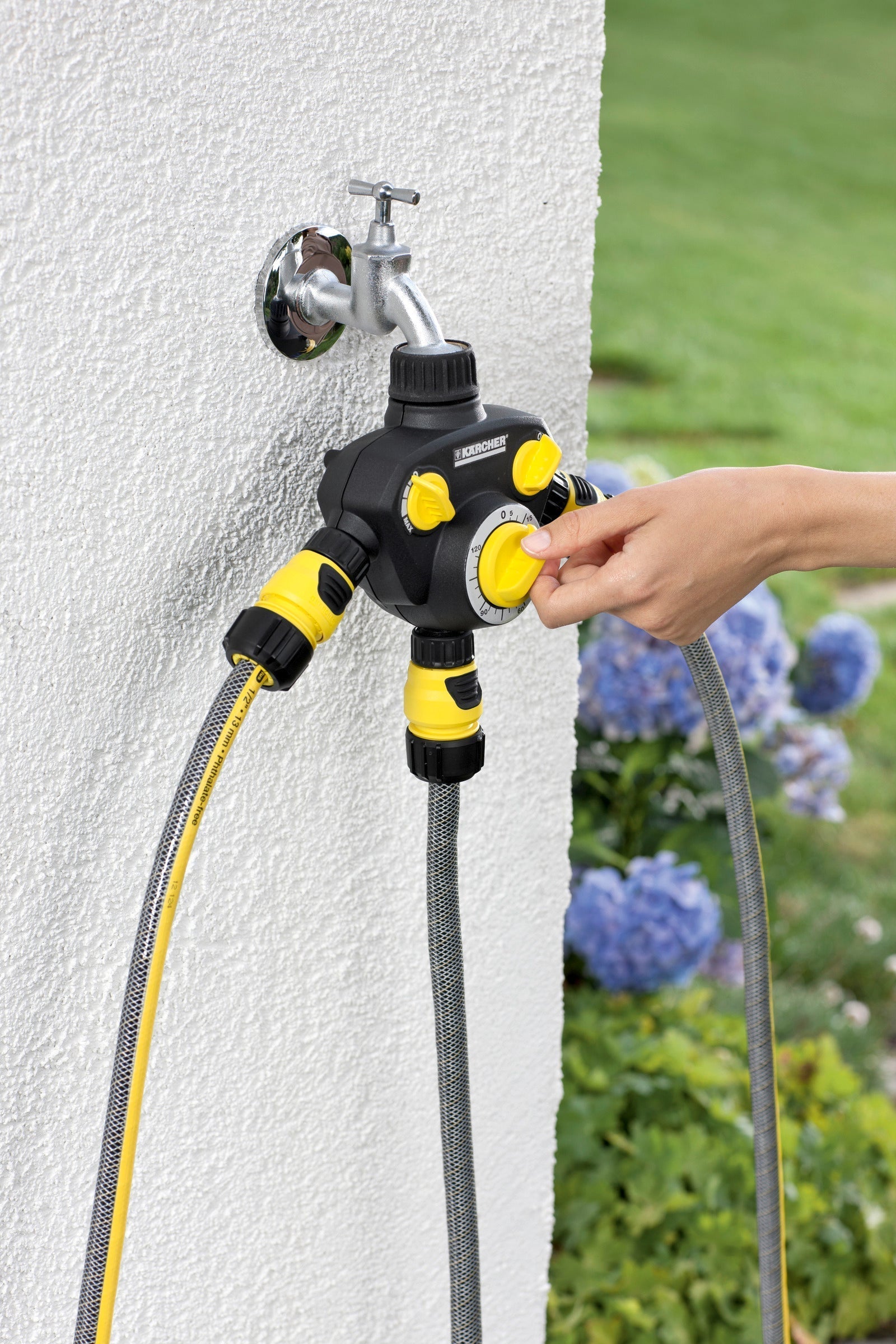 Three-way distributor incl. watering timer. Watering is automatically interrupted when the set time has been reached (max. 120 minutes). With tap connection G1 and reduction piece G3/4.