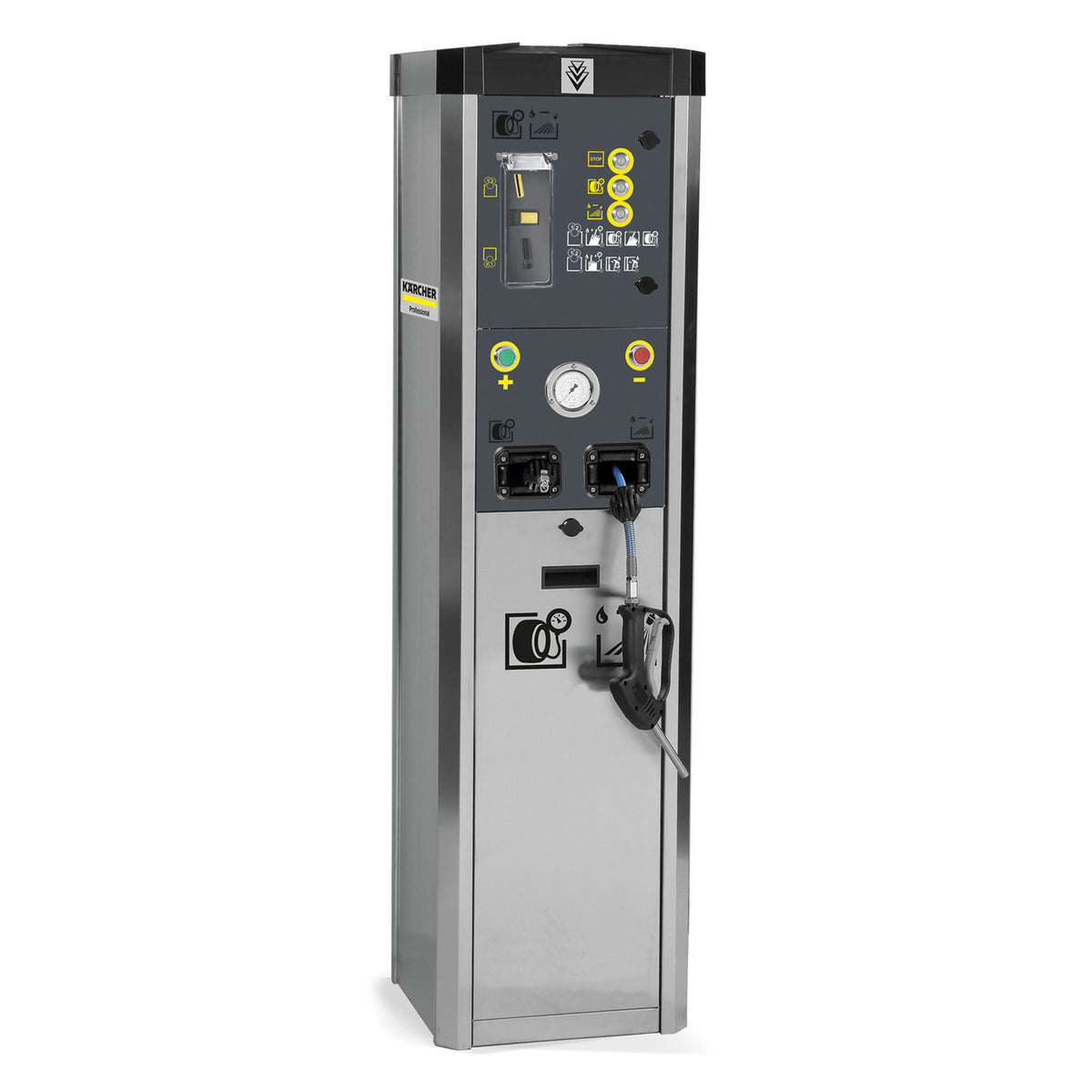With the AWT Fp air and water tower from Kärcher's range of garden units, messy installations are a thing of the past. No tire pressure gauges, watering cans or other similar containers get in the way. Instead, the AWT Fp is a tire pressure gauge and water dispenser in a single, space-saving unit. The tire pressure can be easily checked and regulated up to 8 bar. The integrated water dispenser provides clean water, e.g. for the water tank for cleaning the windshield, while a similarly integrated frost protection function ensures reliable operation in all situations and even on cold winter days. The electronic coin acceptor accepts both coins and tokens and can be easily programmed to meet your specific needs. The device's running time can also be set individually to anything up to 7 minutes.