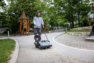 With the compact KM 70/15 C Classic manual sweeper, all indoor and outdoor areas can be cleaned easily and conveniently. When cleaning areas of 100 square meters or more, it is much more effective than a broom. The low weight and low rolling resistance of the wheels make it easy to maneuver and transport. The sweeper roller is driven by the left wheel, ensuring reliable transport of debris to the waste container. When cleaning open areas, it can be folded up out of the way to reduce unwanted dust formation. The side brush can be adjusted to avoid wear. No tools are required when changing the brush. The waste container can be removed and emptied in an instant. The front edge of the container is shaped so that it can be placed in an upright position when needed. The foldable push handle can be adjusted to the operator's height and folded down completely for space-saving storage of the KM 70/15 C Classic.