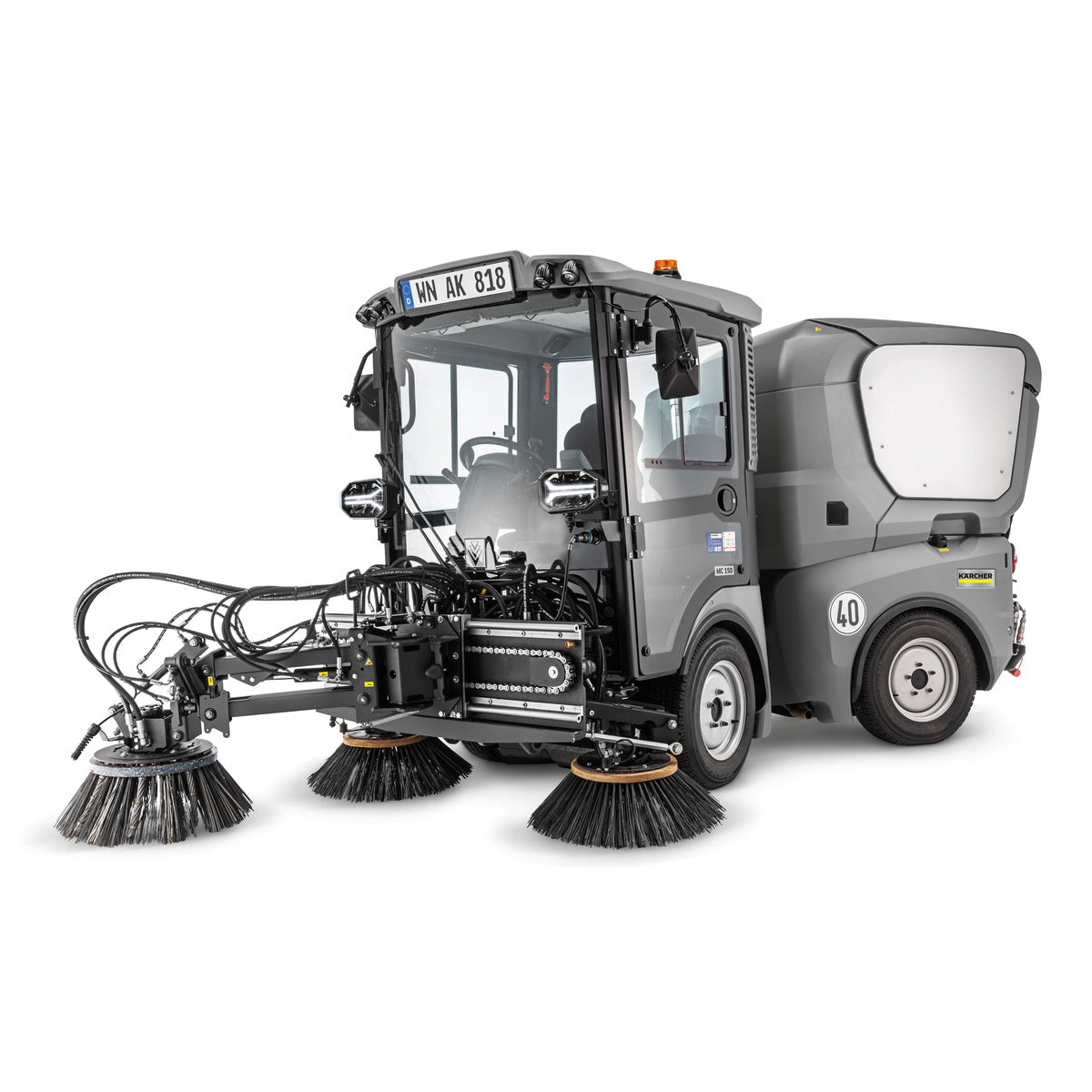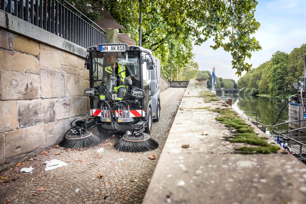 The MC 150 multi-purpose sweeper offers maximum performance, economy and driving comfort in the 3.5-tonne class. The sweeper has many features that make long work assignments comfortable – including the most compact dimensions, a fully sprung hydraulic chassis with independent wheel suspension, a spacious air-conditioned cab with optional passenger seat, back-friendly seats and an intuitive user interface for the 2 m³ class. Outstanding economy is guaranteed by eco!efficiency mode, which balances engine speed, hydraulic power and sweeping performance in automatic sweeping mode. Designed for more than just cleaning, the MC 150 can also be used for winter service, weed removal and even transport tasks.