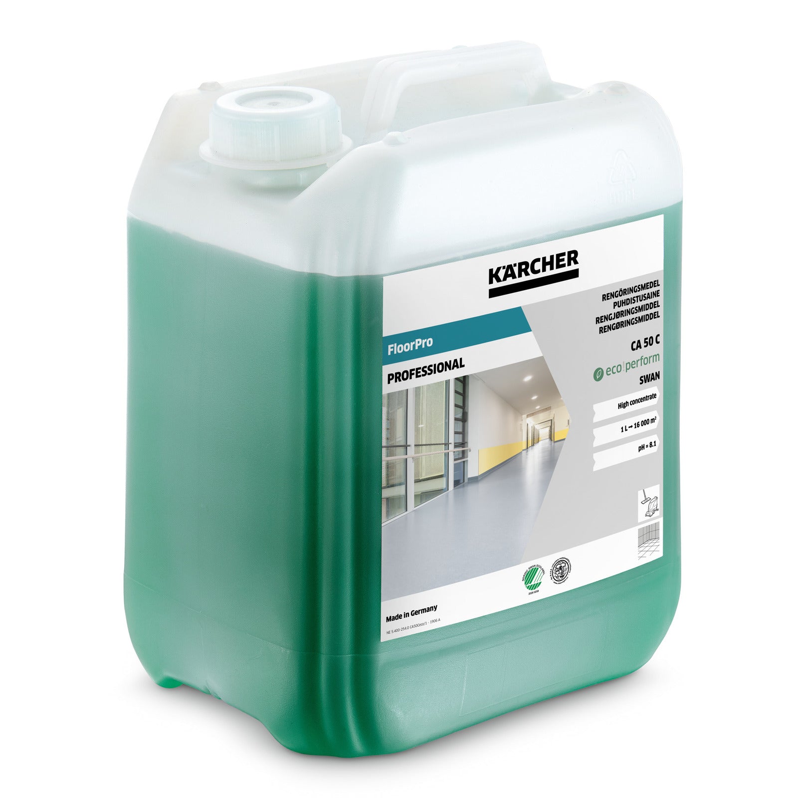 FloorPro Cleaner CA 50 C for manual and machine cleaning of hard and flexible floors, as well as for high-gloss surfaces and furniture. Nordic Ecolabel.