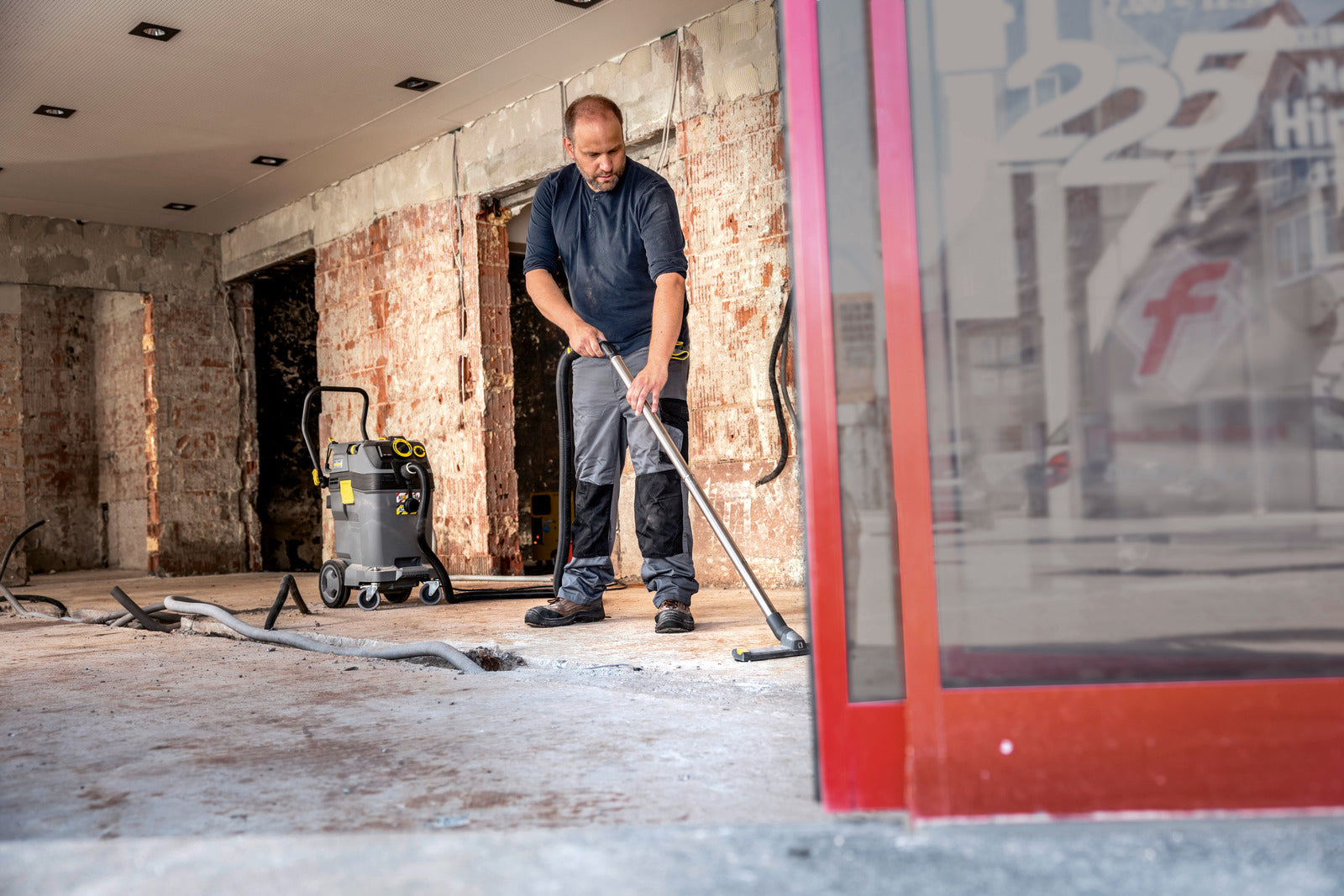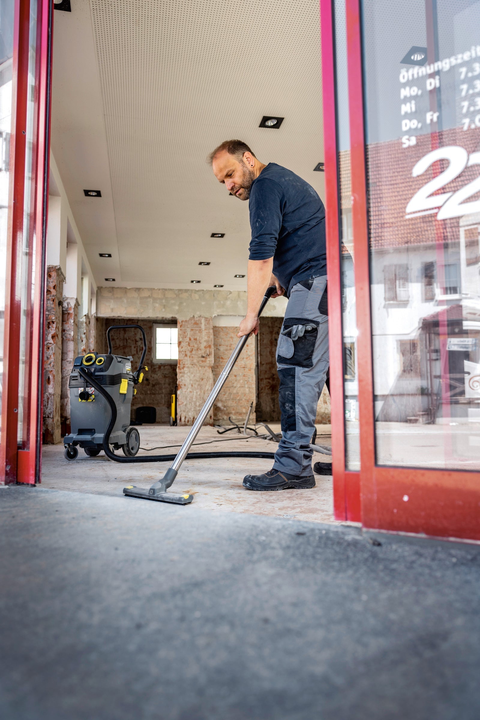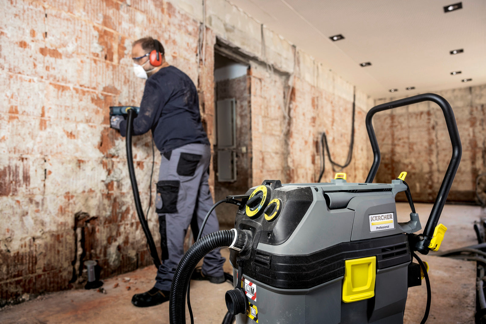 Thanks to the new fully automatic filter cleaning system, our wet and dry vacuum cleaner 50/1 Tact Te M removes quantities of fine dust that have never been achieved before, while guaranteeing a filtration efficiency of 99.9%. The machine uses sensor-controlled electronics to constantly provide optimal filter cleaning and thus maintain consistently high suction power. Together with the large and robust 50-litre container with metal castors and adjustable push handle, the machine is not only able to handle very large quantities of hazardous fine dust in dust class M, but also fixes coarse dirt and liquids. The NT 50/1 Tact Te H is equipped with a power socket with auto-start function as well as a complete anti-static system including conductive accessories. This makes it ideal for direct suction on power tools that generate large quantities of fine dust. Dust that has already accumulated on the floor or on machines is safely removed using the newly developed accessory set consisting of a 4 m long suction hose, stainless steel pipe and a wide floor nozzle. All accessories are safely stored on the machine thanks to smart storage solutions.
