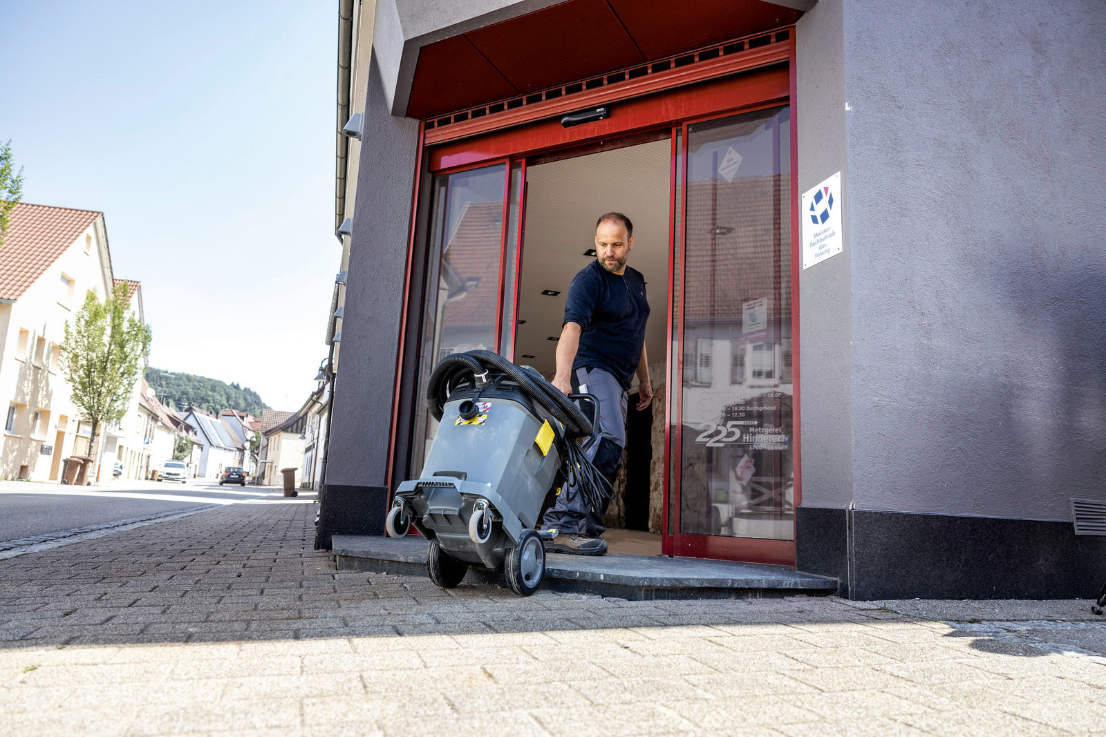 Developed for very large quantities of hazardous fine dust in dust class M: The large and highly mobile wet and dry vacuum cleaner 50/1 Tact Te M with a 50 litre container and adjustable push handle.
