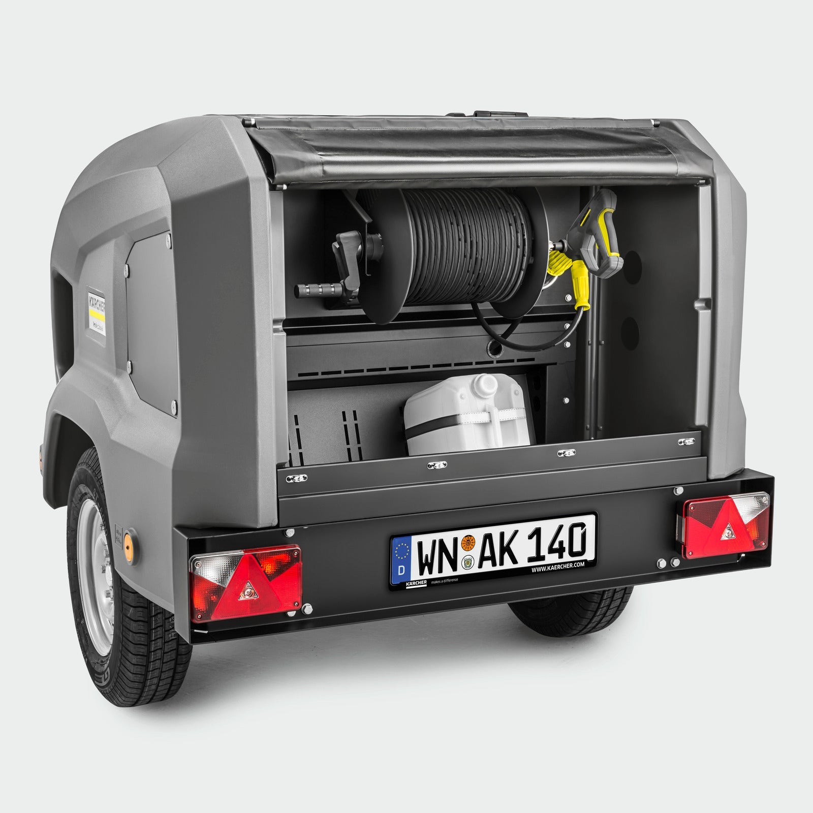 Our mobile, unheated HD Trailer 9/23 De Tr1 is completely self-contained thanks to a powerful, reliable and environmentally friendly (EU STAGE V) Yanmar diesel engine and a 1,000 liter water tank. The trailer performs a variety of high-pressure cleaning tasks that are often encountered in municipal operations or in the construction sector in the easiest possible way. With a working pressure of 230 bar and a flow rate of up to 930 liters per hour, there are practically no limitations. The HD Trailer is equipped as standard with an ergonomic EASY!Force spray handle and many storage options. This robust machine is also easy to use and is available in several configurable versions – for example with a hose reel at the rear or in a Cab version (open version).