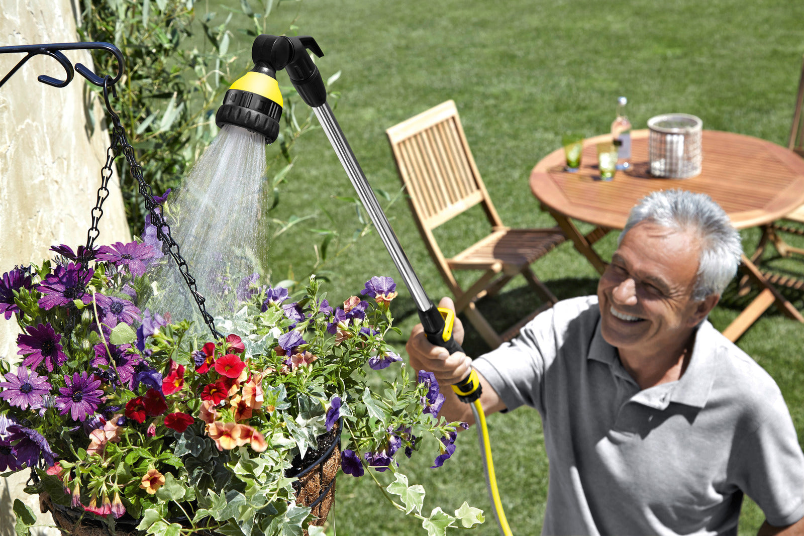 The Kärcher ergonomic spray lance Plus combines perfect details with convenience. For versatile use in the garden. The spray lance Plus is ideal for watering small to medium-sized areas and gardens. It is also ideal for hanging baskets. The perfect combination of elegance, first-class functions and perfect ergonomic design makes the Kärcher spray lance Plus ideal for smooth watering even in more time-consuming watering situations. In short: the ideal solution for a variety of applications in the garden. Note: Kärcher spray nozzles and spray lances are compatible with all available click systems. Features: adjustable spray head angle (180°), smooth one-handed flow control (including ON/OFF function), easy storage on open hook, robust materials and six spray patterns.