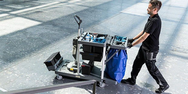 Uppgradera ditt team! Vår professionella FlexoMate-städvagn säkerställer ökad hastighet och effektivitet i städprocessen. Den flexibla och modulära vagnen är lämplig för omfattande städuppgifter samt olika kundkrav. Med sin ergonomiska struktur och höjdjusterbara handtag minskar den fysisk ansträngning och avlastar axlar och handleder.