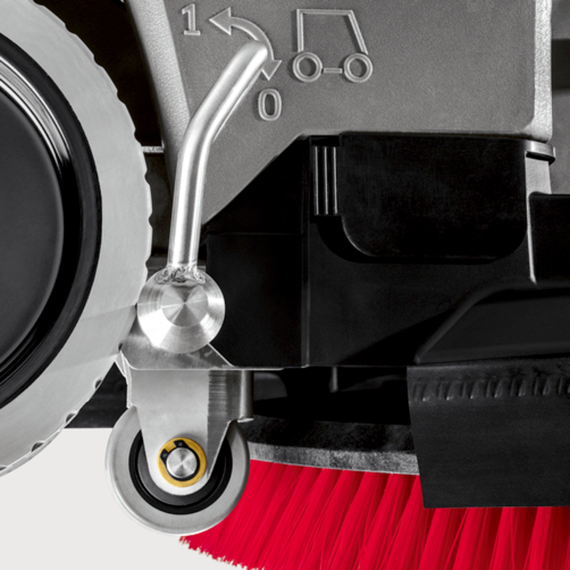 Magnetventil för automatiskt stopp av vattnet efter att dödmansgreppet har släppts upp. Den utfällbara transportrullen möjliggör den praktiska tvåstegsmetoden. Utfällbar transportrulle förenklar transport av maskinen markant.